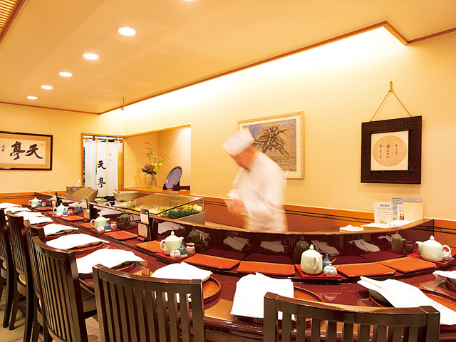 カウンター中心の店内。旬の食材が揚がる様子を見ながら