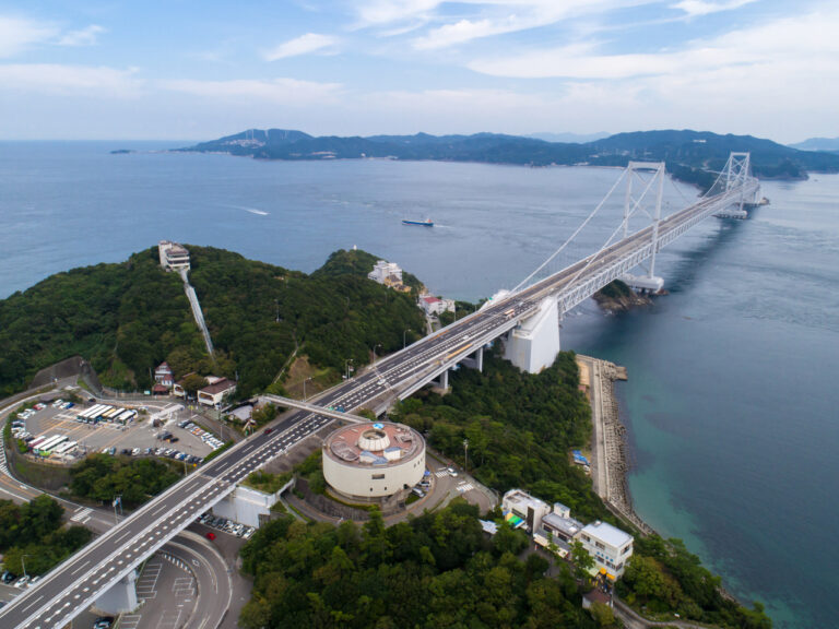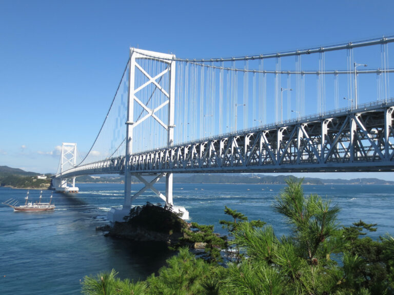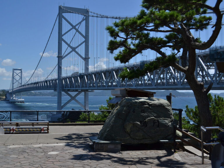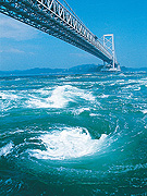 鳴門海峡をまたぎ、四国(鳴門)~淡路島を結ぶ全長1629mの吊橋。平成10年(1998)に完成した明石海峡大橋と連絡し、神戸~鳴門を結ぶ高速道路になっている。大鳴門橋を渡る鳴門北IC~淡路島南IC(普通車通行料ETC車平日690円)を、車で走るのもおすすめ。途中での駐停車は禁止なので注意。