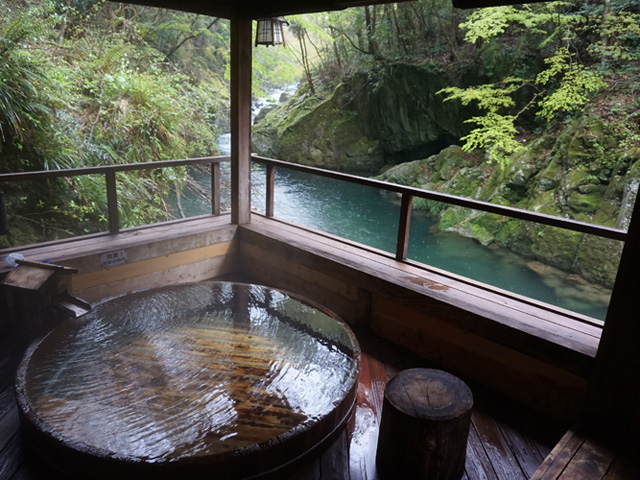 A day bath is also accepted at a resort hotel on the island of Izu and Amagi Yuke. You can enjoy the beauty of the valley and the whole green of the valley from the open-air bath at the source of the spring, which faces the Sakogyo Gorge of the Nekogoshi River, a tributary of the Kano River. The fresh green in May, fireflies in June, river play in the summer, and the autumn leaves and the scenery of the four seasons are beautiful in October. The surroundings are lit up at night. Large baths for single men and women also flow from the source. Accommodation is from 8250 yen per night for 2 meals (1 room for 2 people). A private bath is also available for day bathing (due to availability on the day, no advance reservation).