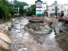 Located on the riverbank of the Katsura River, it is an impressive spot for its yutsuya, which blends into the surrounding scenery. It is a symbol of Shuzenji Onsen, where the legend that in the old days, Hiroho Daishi smashed rocks with Buddhist utensils to spring up the hot springs. Bathing is not possible.