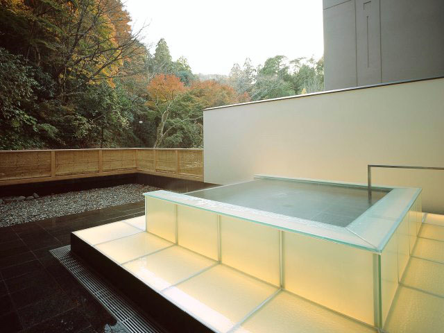 This inn is located in the center of the hot spring town of Shuzenji Onsen, but is surrounded by the magnificent nature of 15,000 tsubo. Day bathing can be enjoyed in a large bathhouse with two open-air baths and a private open-air bath. The modern bath is spacious and pleasant. The open-air baths are designed by space designer Hisanobu Tsujimura, respectively, with a glass tub beaming a pale light on the darkness of the night, an ark-like light floating in the air, and an open-air bath at sunset where you can enjoy the bath while watching the sunset over Mt. The two free-end open-air baths, rock and Izuishi, are open with a view of the Shuzenji onsen town and the surrounding greenery.