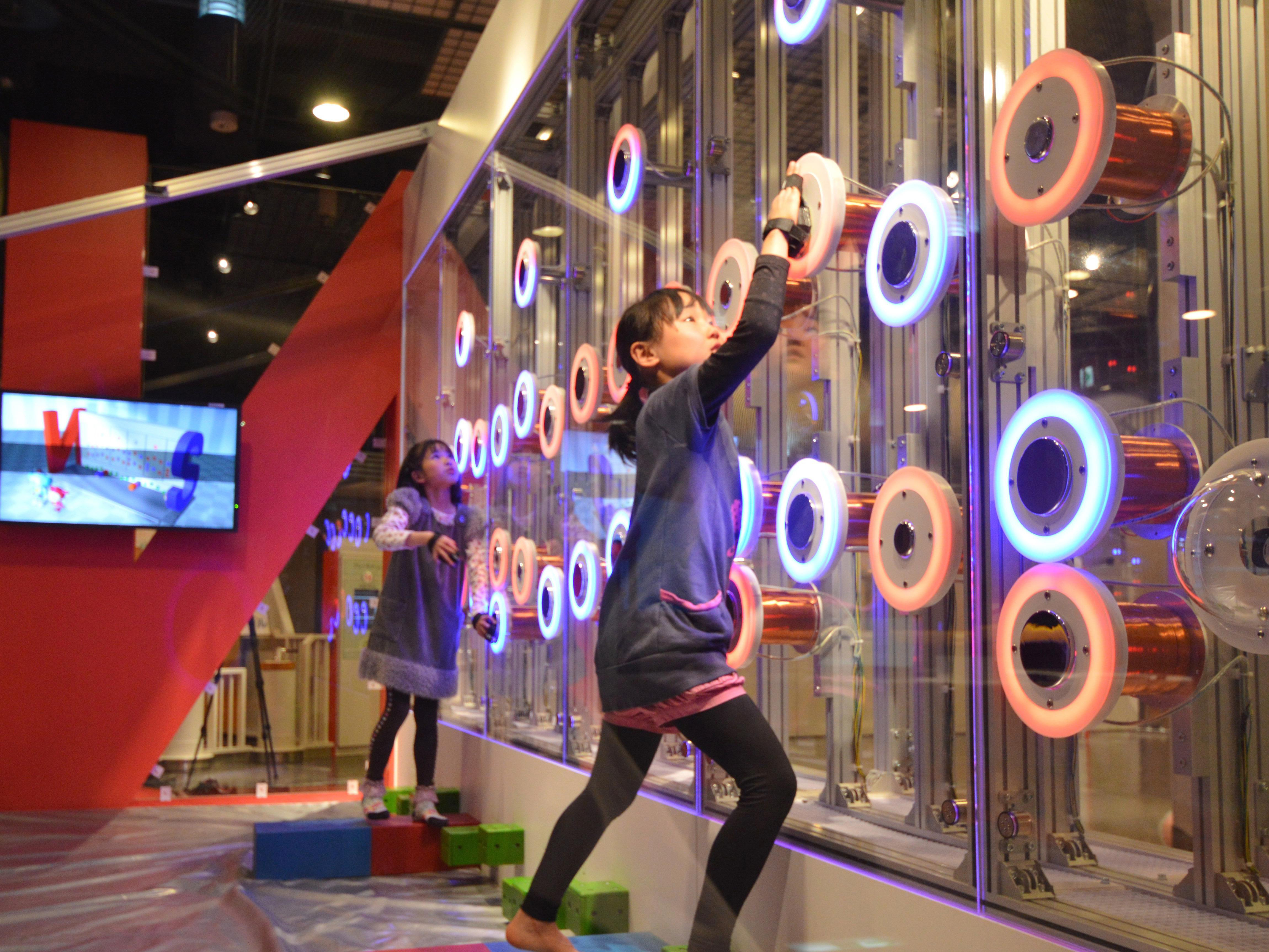 磁石のグローブをはめて、N極とS極が入れかわる壁にはりついて渡る「はらはらウォール」