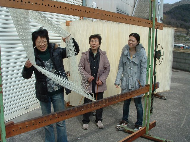 작품의 국수 제작자 (국수는 젓가락으로 더 길게 늘어납니다)