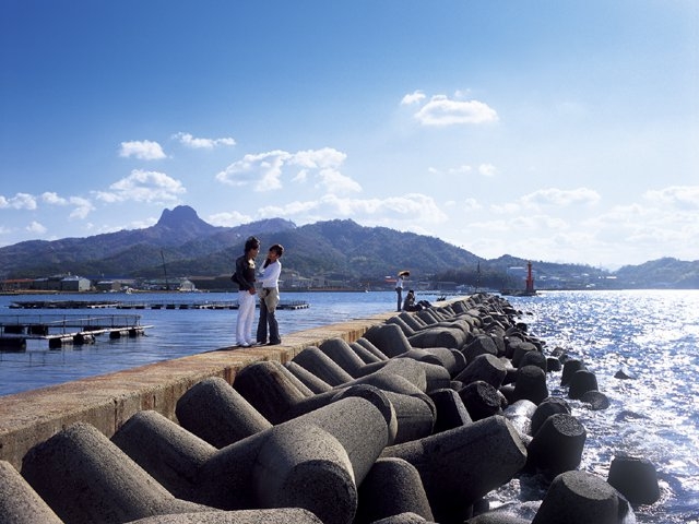 映画『世界の中心で、愛をさけぶ』のロケ地となった庵治漁港の防波堤。主人公のサクとアキが夕日を眺めながら語り合う印象的なシーンで登場。