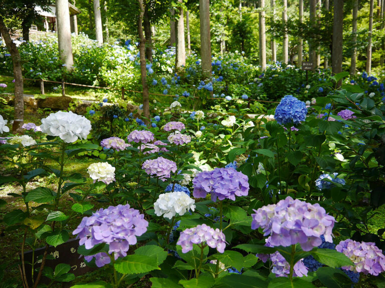 오하라를 대표하는 monkami 사원 인 Sanzenin. 조용한 구역 뒤쪽에 뻗어있는 수국 정원에서는 1000 개 이상의 수국 식물이 우아한 꽃을 생산하고 있습니다. * 9 시 개장 17 시.
