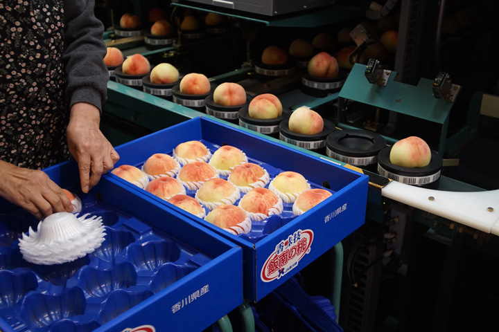 国内で唯一、JA香川だけが持つ高精度センサー【香味技】。最新鋭の光センサーで、桃の糖度(甘さ)だけでなく、硬度や果肉障害の有無まで総合的に果実を測定します。