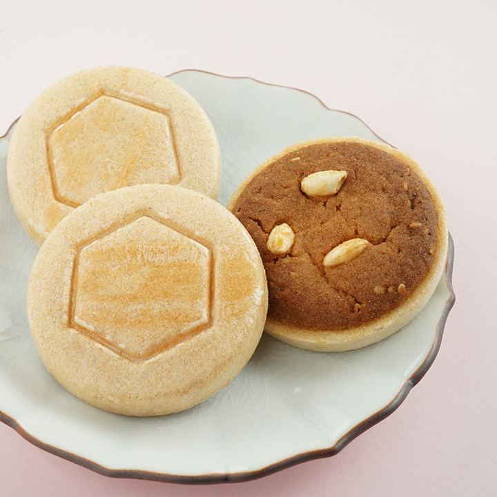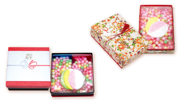 原材料はもち米と砂糖。ふわっとした軽い食感が特長の餅菓子で、主に香川県の西部で結婚式の引き出物として使われています。その鮮やかな彩りと可愛らしい丸い形が人気となり、新しい香川県のお土産品としても注目されています。