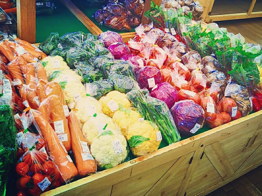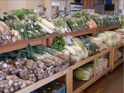 ファーマーズマーケットでは地元産の新鮮な野菜、果物、米などを毎朝入荷
