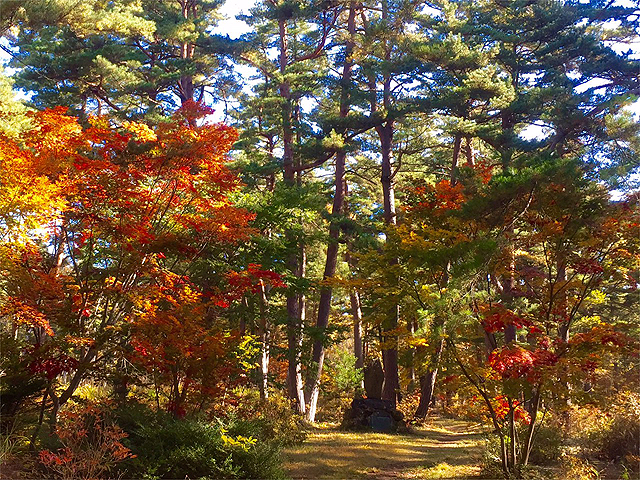 この地には、平安時代の伝説の鬼女紅葉[もみじ]を供養する鬼立山地蔵院があったが、その後、江戸時代に曹洞宗の禅師を迎え松巖寺となった。本堂の欄間には曹洞宗の開祖・道元[どうげん]禅師の一代記が彫られており、格天井には見事な花鳥画がはめられている。妖術を使ったという鬼女紅葉[きじょもみじ]の伝説は興味深い。