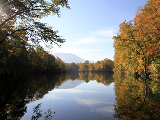 早朝の鎌池は風がなく、水面に反射する紅葉がとても綺麗