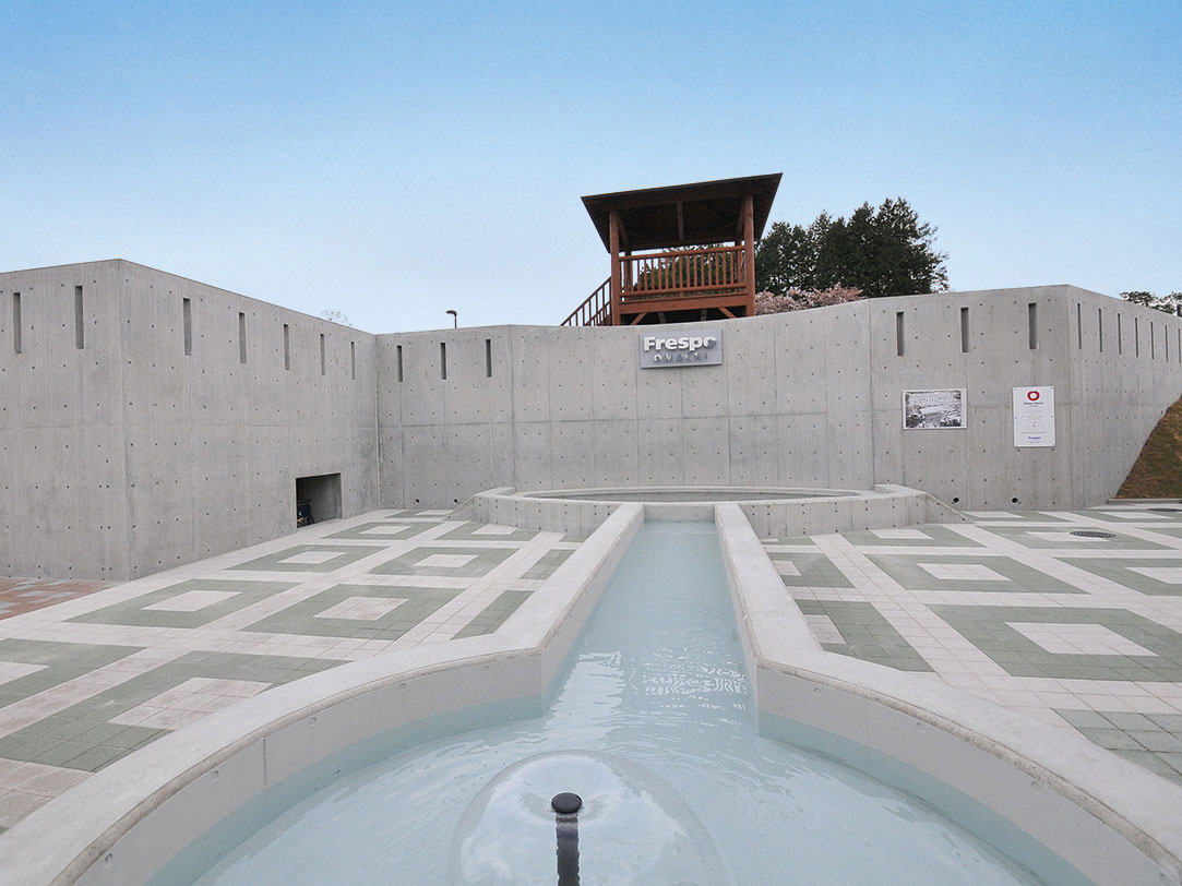 井戸水を利用した池と、黒部ダムをイメージした放水ミスト設備