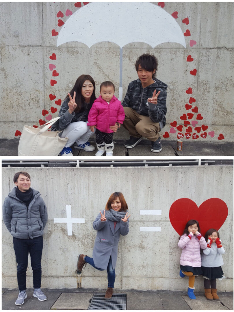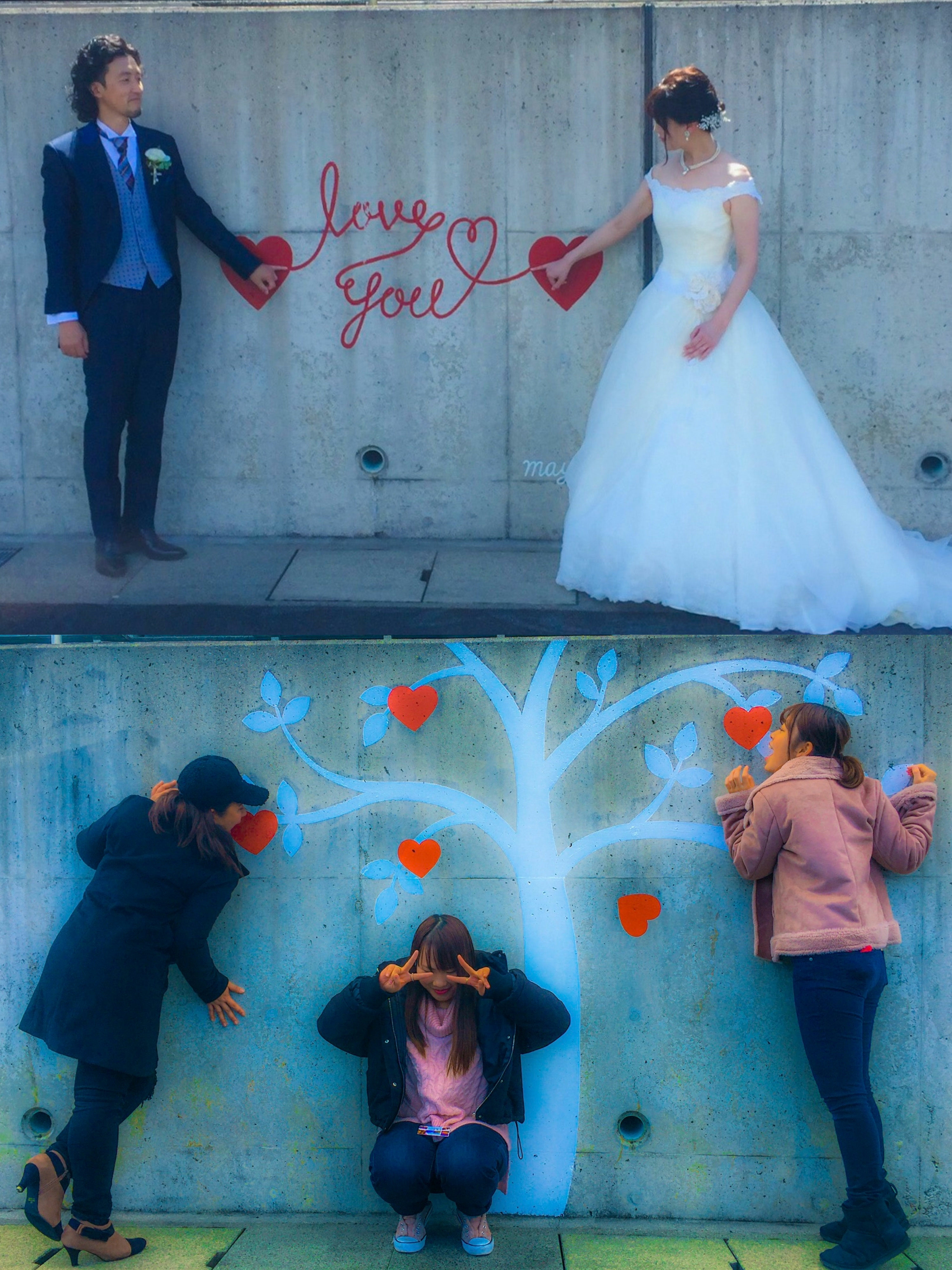 恋人の聖地 壁画「ハートの壁」と「相合傘」