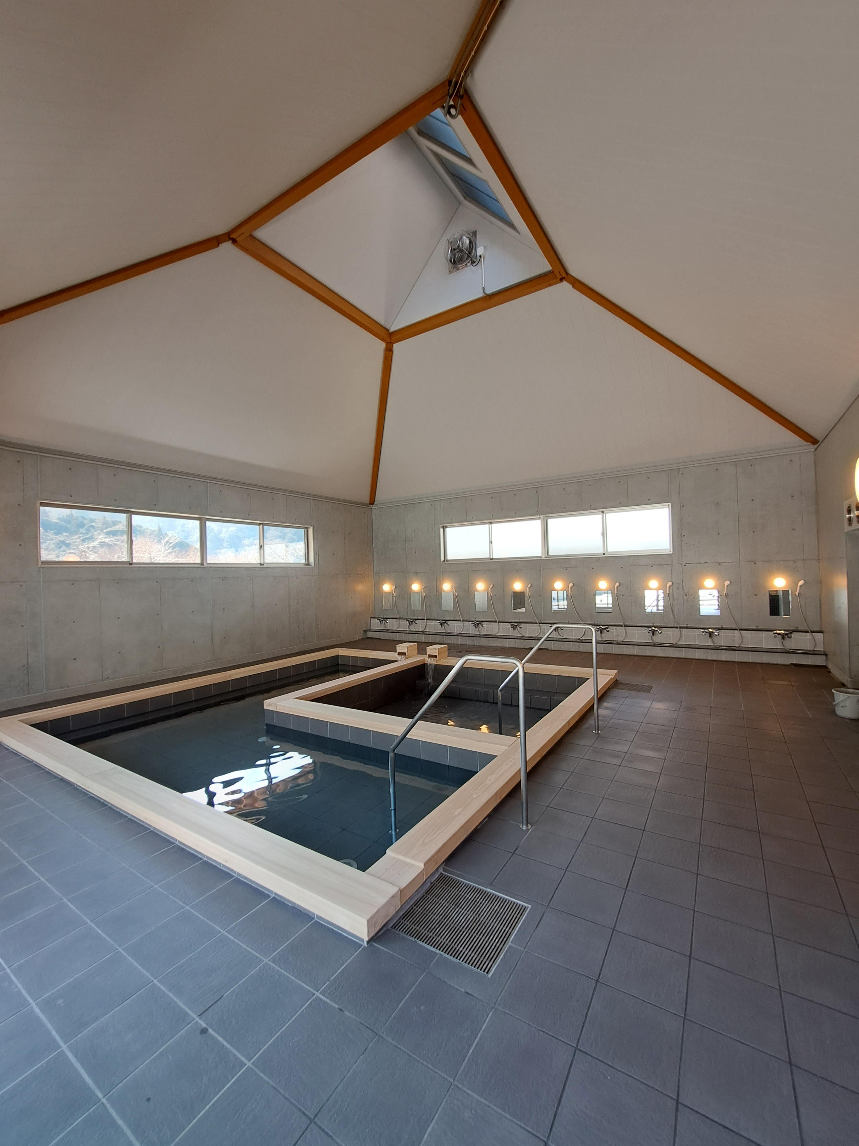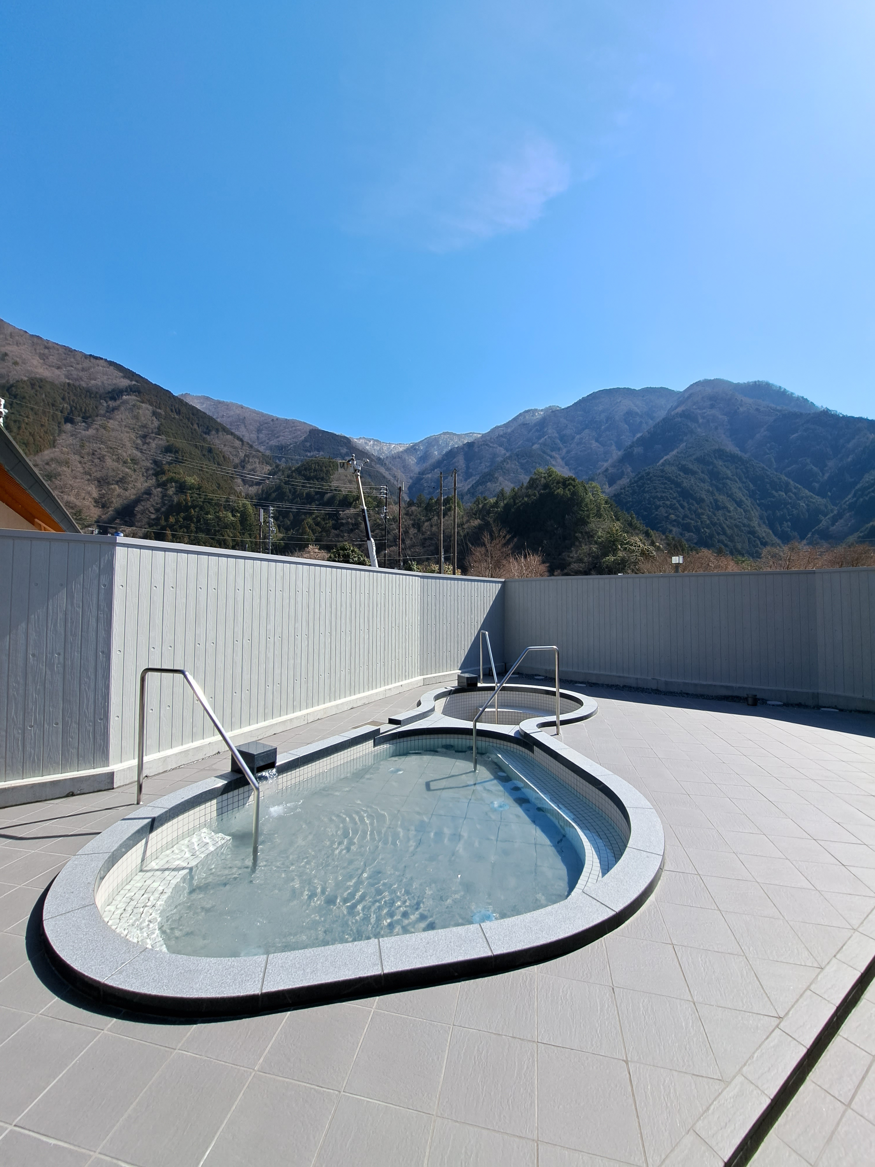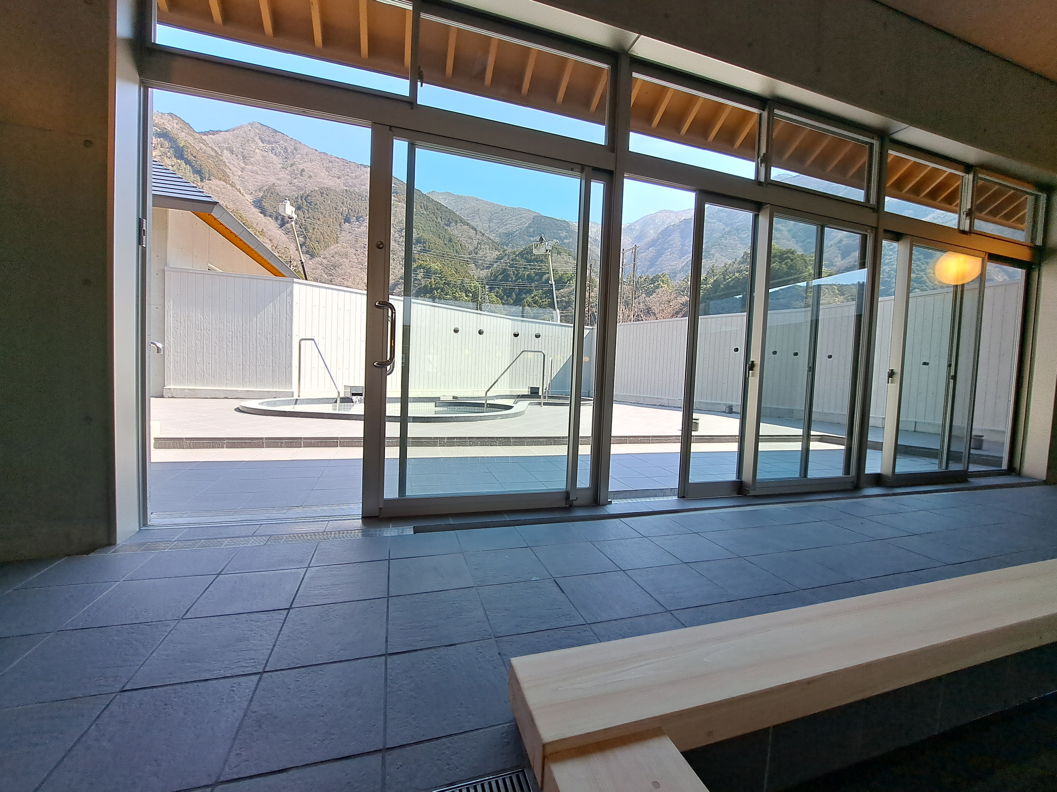 安倍川の支流の一つ、中河内川の源流沿いにある口坂本[くちさかもと]温泉の共同浴場。山々に囲まれた温泉郷で、泉質はナトリウム-炭酸水素塩泉。浴槽は30人ほどが入れる広い温泉浴場と庭園を望む露天風呂がある。食事の施設はないが、休憩室へ持ち込みは可能だ。