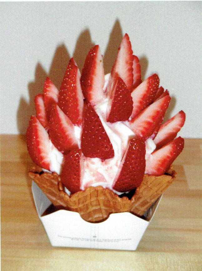 苺のタワーソフトクリーム。ワッフルボウルに苺のシャーベット、ソフトクリームに苺をトッピング