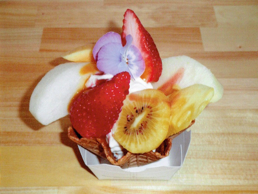 パフェフルーツボウル。ワッフルボウルにシャーベットとたくさんの果物をトッピング
