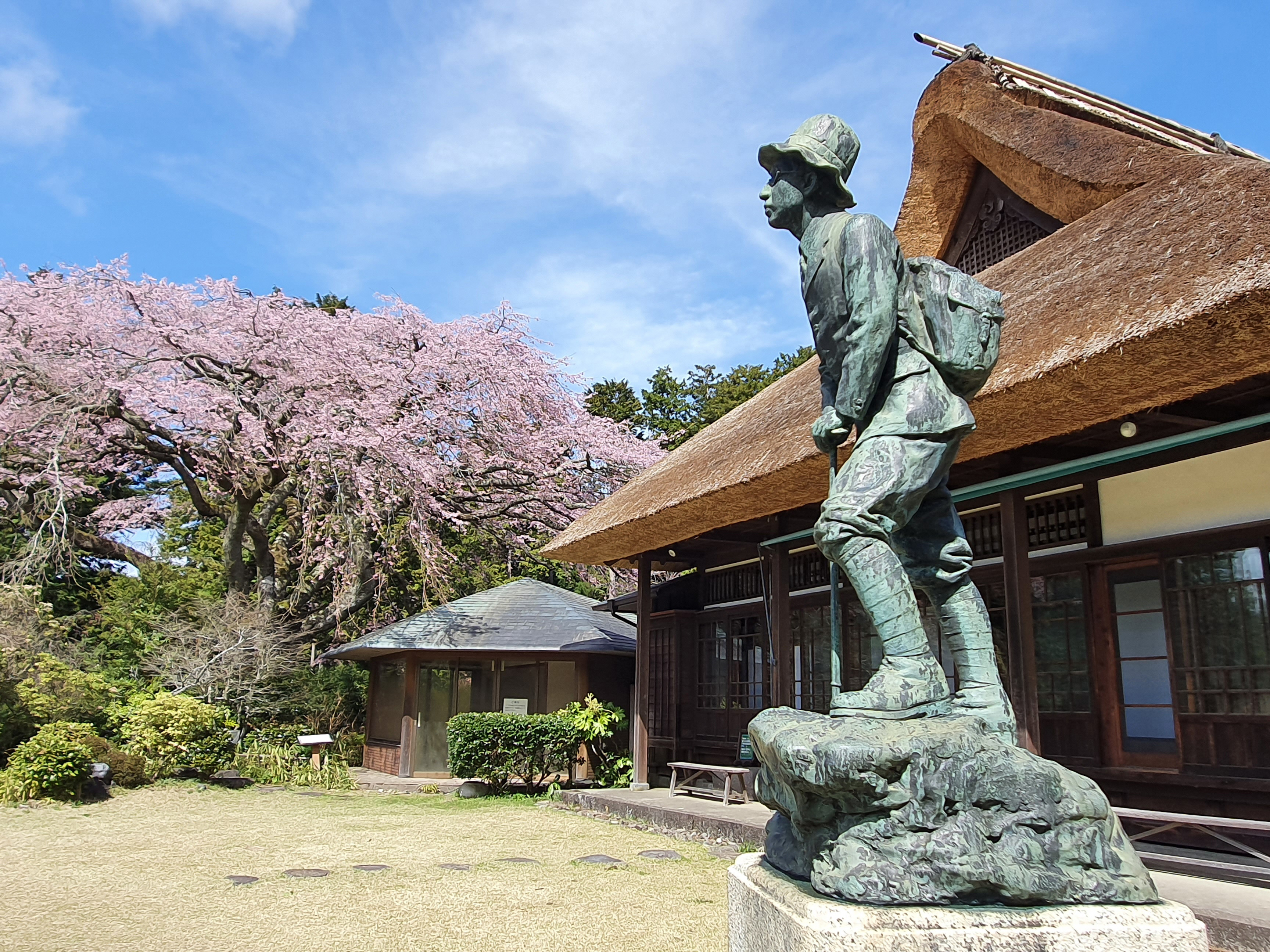 シンボルのかやぶき母屋と樹齢約140年の枝垂れ桜