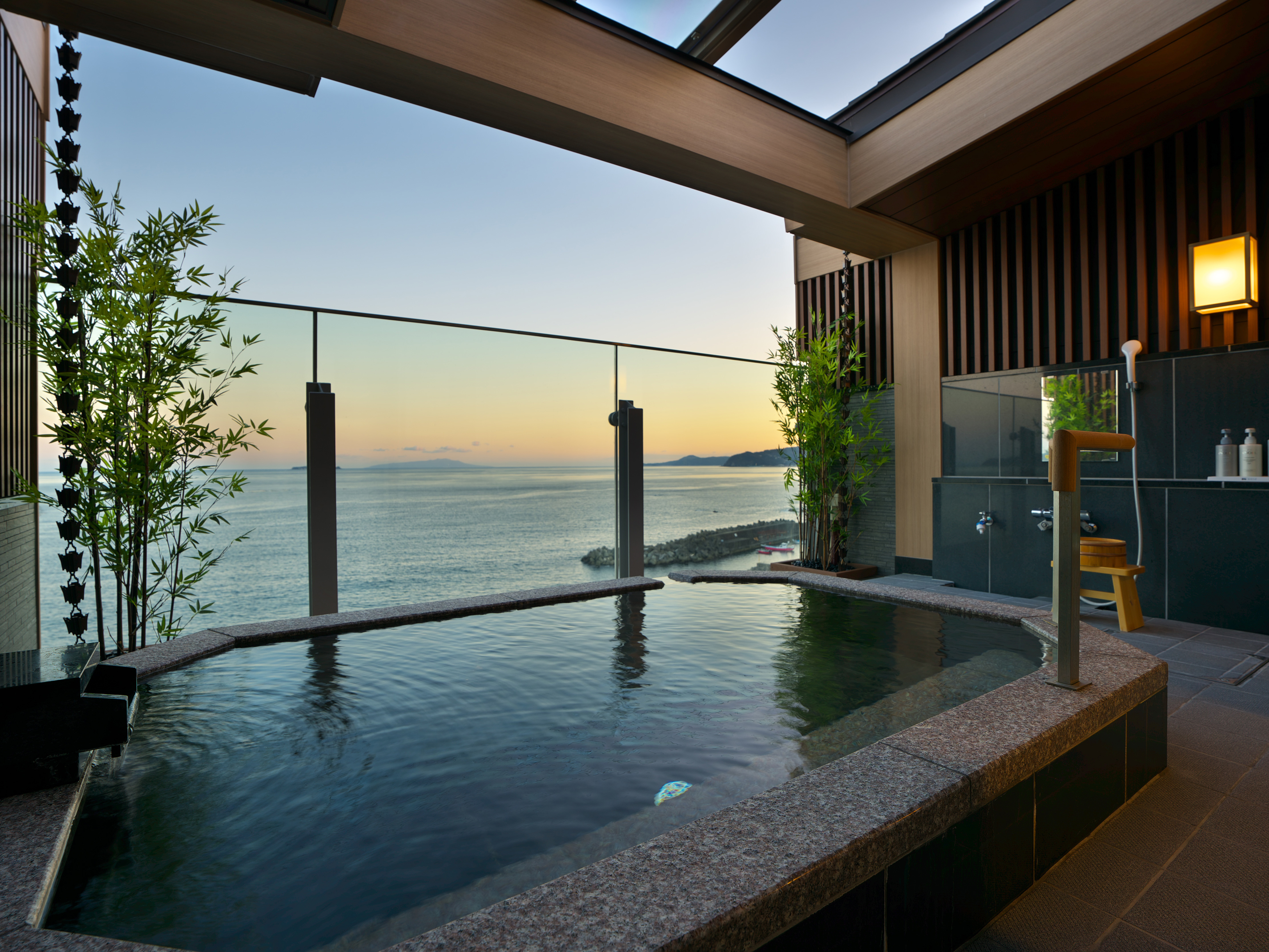 贅沢な屋上貸切露天風呂からもすばらしい海景が眺められる