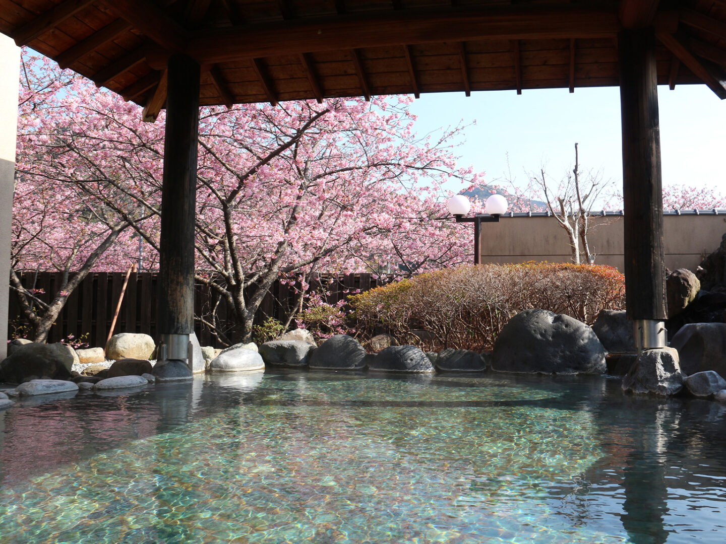 敷地15万坪内に、美しい7つの滝が連なる名勝「河津七滝」で「伊豆最大級」落差30m幅7mの大滝[おおだる]を擁する。そのパワースポット大滝を眼前に浸かる「滝しぶきの湯」など、秘境天城の大自然に抱かれる100%源泉かけ流しの混浴絶景露天風呂群(7カ所)は、それぞれの湯船に自然を巧みに取り入れた趣向が凝らされている。3本の源泉から湧き出る風呂が楽しめる。外湯は混浴で水着着用必須。水着は300円で借りられ、手ぶらで出かけても大丈夫。