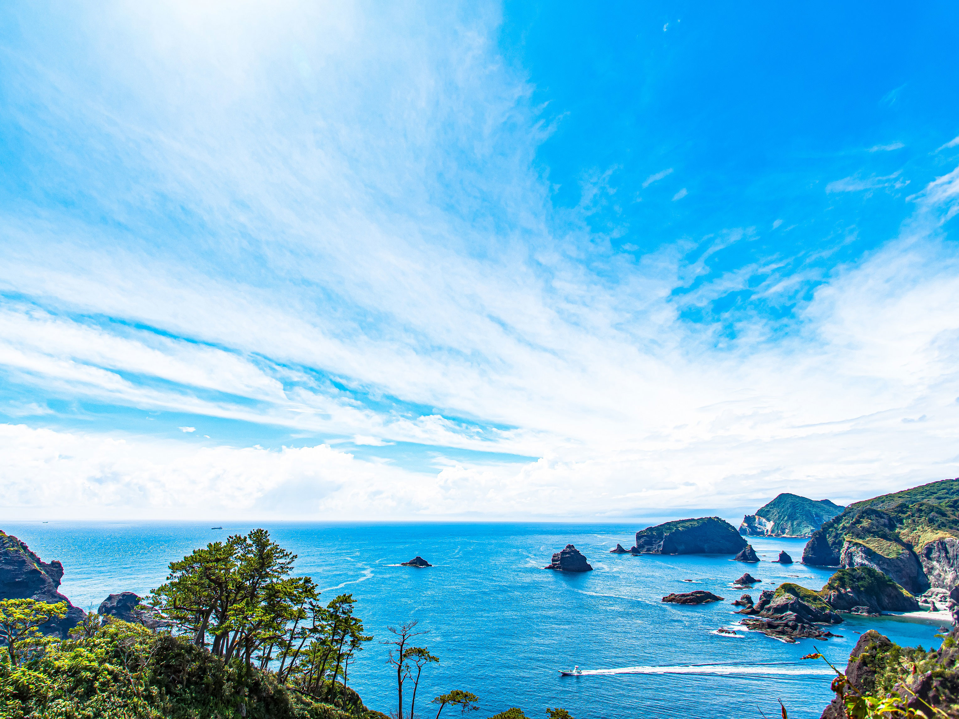 切り立った高さ約260mの断崖が続く波勝崎海岸の南端の岬。小さな入江の大窪浜の波勝崎苑には、野生の日本猿が生息する。野猿は300頭以上いて、撮影したりフェンス越しに餌を与えたりできる。バス停:波勝崎口から堂ケ島発のバス(1日1本)の利用。