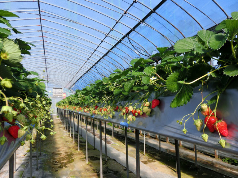 イチゴランド カプリ 60分間食べ放題。天敵を利用し、できるだけ農薬を使わずに育てられた「紅ほっぺ」と「おいCベリー」を食べ比べ。園内を自由に歩きながら、赤く甘く熟したイチゴをほおばる楽しさを味わえる。ビニルハウスの中で高設栽培しているので、摘み取ってそのまま食べられる。練乳や飲み物の持ち込み可(要予約)。