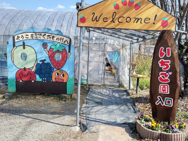 里の駅広川くだもの村 農園で採れた新鮮な果物を中心に地元の農産物や惣菜、手作りパンなど豊富に揃う。隣接するイチゴ園では、あまおうはじめ数種類のイチゴ狩りが楽しめる。手作りのフルーツジェラートもおすすめだ。