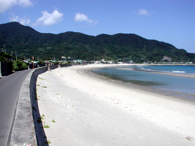 串木野の西側38kmにある甑島[こしきしま]の南端のビーチ。遠浅の白砂で海水浴に最適。6~7月にかけて、産卵のため海ガメが上陸する海岸としても知られる。砂浜からキスの投げ釣りもできる。周辺には「おふくろさん」の歌碑、ナポレオン岩、観音三滝などもある。