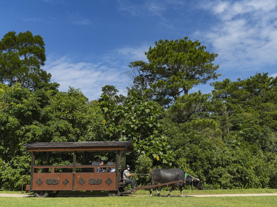 ガイドを聞きながら水牛車に揺られ園内散策へ