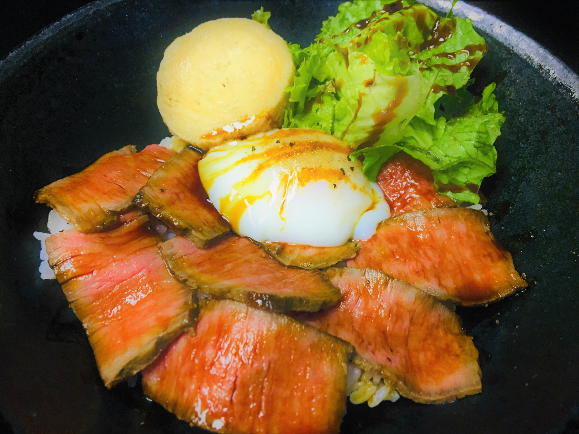 NIKKO丼。前日光和牛ローストビーフと日光名物の揚巻ゆばの煮付け、温泉玉子と地元産のコシヒカリの丼
