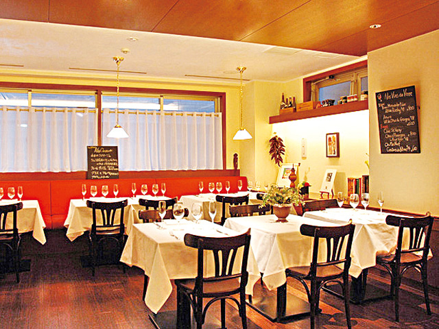 壁際の赤いソファ席と白いテーブルクロスのコントラストが美しいディナー時の店内
