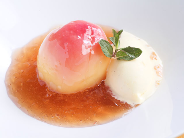 夏季限定もものコンポート(丸ごと桃を白ワインでゆっくり丁寧に煮込み特製バニラアイスクリームを添えて)