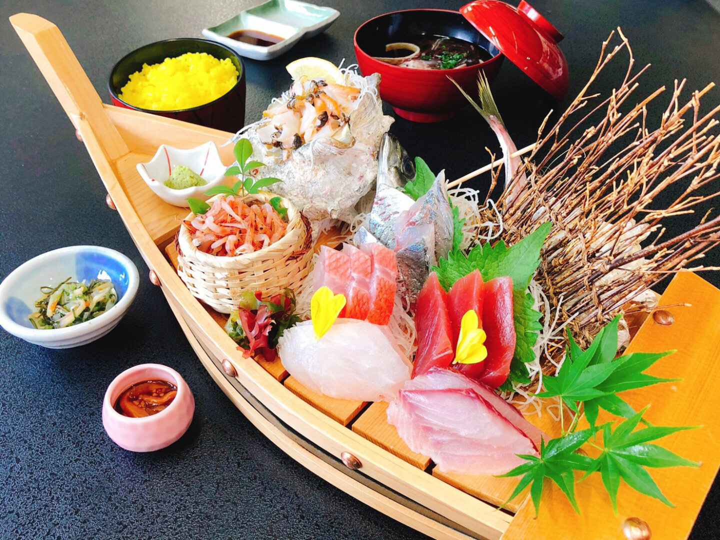 大漁船盛り刺身膳。新鮮な刺身を豪快に味わえる
