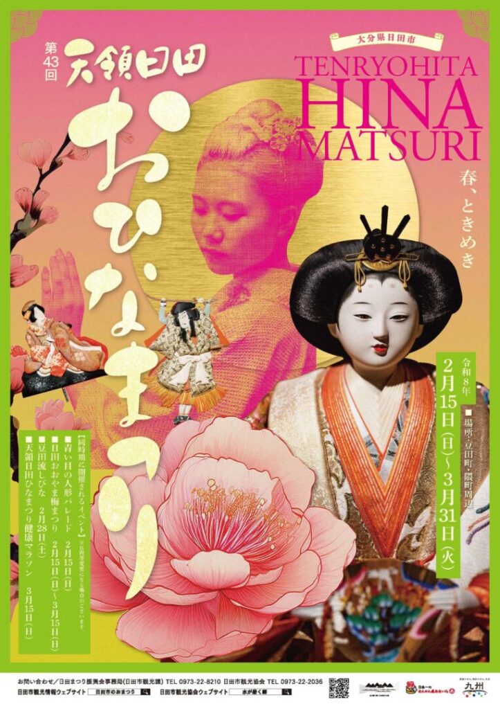 そして2023年で40回目を迎える「天領おひなまつり」は町の歴史の記憶を大事に守り継いでいくお祭りとして、日田市民の誇りとなっています。沢山の雛人形はもちろん、当時の旧家やその町並みが未だに残る豆田町や隈、天瀬町など、物や場所を大切にする、「日本らしい日田の心」も見て・感じてみて下さい!