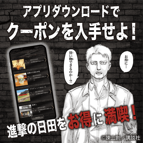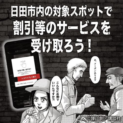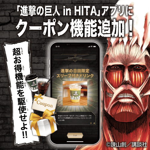 進撃の日田エリアの様々な店舗・施設で利用できるクーポンを『進撃の巨人in HITAアプリ』から自動配信!