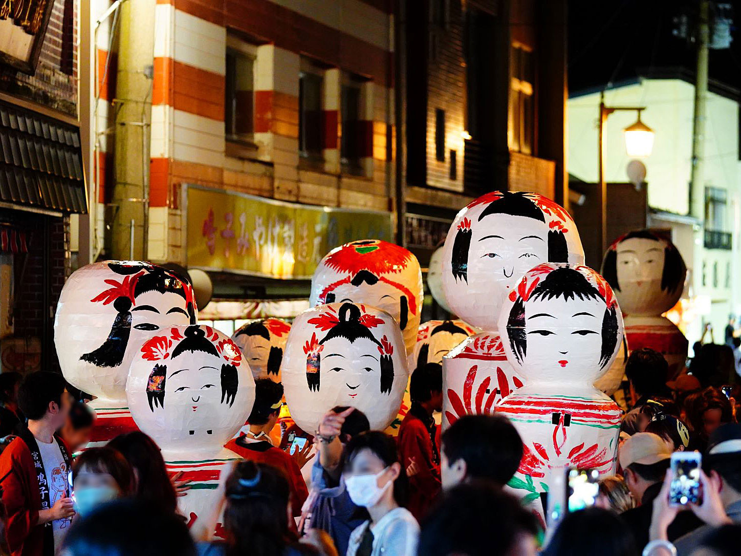 第68回全国こけし祭りフェスティバルパレード(張りぼてこけし)の様子