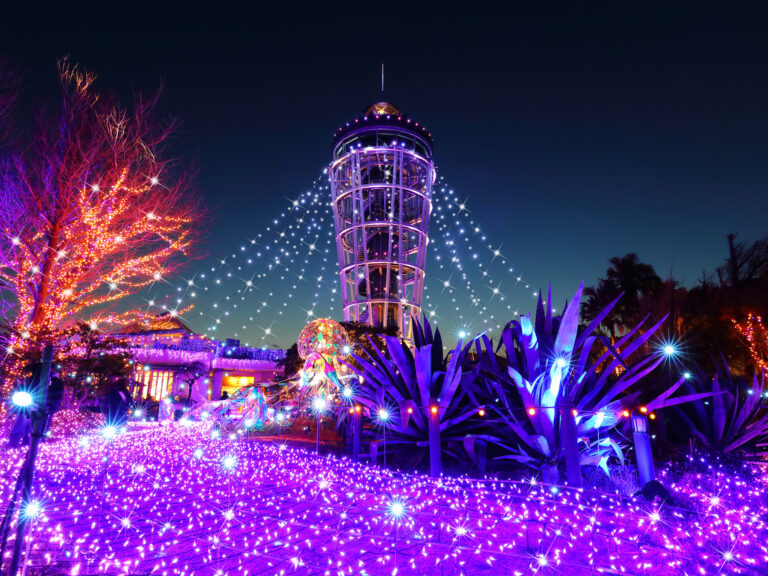 江の島のシンボル、江の島シーキャンドルライトアップ「光の大空間」は、高さ60mから吊るされるイルミネーションに包まれる。夜景観光コンベンション・ビューローの関東三大イルミネーションにも選ばれており、日本有数の規模を誇る空間演出。江の島島内から片瀬海岸周辺まで街全体がライトアップされる。 画像提供:Photo.N.Ichikawa