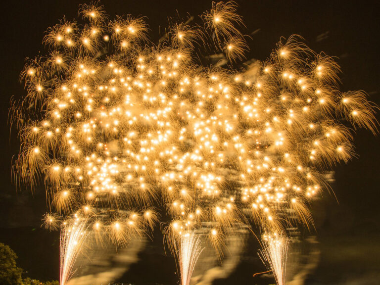 安曇野の夏の風物詩として親しまれている安曇野花火。2024年のテーマは「心ふるえる安曇野の夜」。色とりどりの花火が夏の夜空を彩る。公共交通機関利用のこと。 画像提供:安曇野花火実行委員会