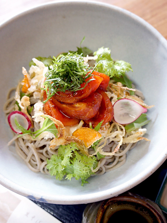 どこか懐かしい町並みの黒磯駅前に店を構えて70年余り、先代からの味を守りつつ、新しさにも目を向けているそば処。店おすすめのそばがきコロッケは、那須鶏、地蕎麦粉を用いて薫り高くカリッ、ふわっの食感がいい。そばがきコロッケとそばのふよう定食1100円。メインのそばも、「焼きトマトと豆腐のぶっかけそば」1100円など地の食材をふんだんに用いたメニューが豊富。夏期には清流那珂川の鮎天ぷらを肴に地元の日本酒やビール、ワインを。
