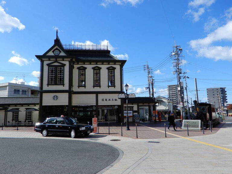 明治の面影を残すレトロな駅舎。松山市内をガタゴト走る「坊っちゃん列車」の留置線があり、記念撮影の人気スポットだ。