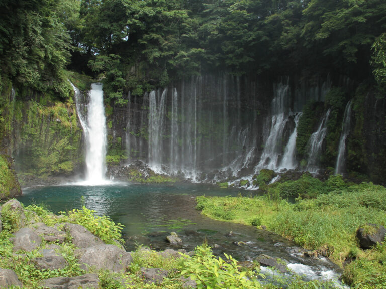 Spot白糸ノ滝溶岩断層から、富士山の雪解け水が長い年月の末湧き出し、滝となったもの。幅150m、高さ20mのU字型をした崖の全面から流れ出す水量は毎秒1.5トン。これが無数の滝となって落ちる様子が、絹糸を垂らしたように見えるところからこの名がある。滝壺まで遊歩道、階段が整備されており、水辺から見上げることができる。Alibaba2025/05/26