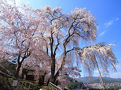 Spot勝間薬師堂・しだれ桜高遠さくらホテル南側の小高い場所に建つお堂。境内には樹齢140年と推定される大きな枝垂れ桜があり、勝間の里に春の訪れを告げる。老桜が3本並び、枝が風に揺らめく様は幻想的だ。遠景もみごと。Alibaba2025/05/25