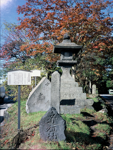 京都へ向かう中山道と、越後へ通じる北国街道の分岐点。旅人同士が、ここで別れを惜しみ、涙とともに袂[たもと]を分けて旅を続けたといわれるのが、名の由来だ。道標のそばには、石の常夜燈などが、当時のままに立っている。石碑には、「さらしなは右 みよしのは左にて 月と花とを追分の宿」の歌が刻まれている。これは、江戸から来た場合、右へ行けば月の名所更科から善光寺を越えて越後路へ。左に進めば、木曽路から東海道を通り、桜の名所吉野へと道が続いていることを示している。