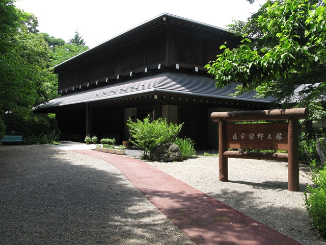 江戸時代、追分宿周辺で使用されていた行灯[あんどん]や帳簿など、当時の様子を今に伝える宿場関係の道具や資料を展示している。千本格子を巡らせた出げた作りの建物は、旅籠[はたご]を模したもの。館内には茶屋の入口を再現した風情漂う囲炉裏端[いろりばた]のコーナーもある。2階には追分宿に関する歴史書や文学図書が閲覧できる図書室が併設され、町指定文化財の大般若経[だいはんにゃきょう]550巻や軽井沢出身の書家稲垣黄鶴[いながきこうかく]の作品など、貴重な所蔵品も見られる。所要30分。
