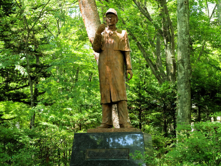 分去れの碑から旧北国[ほっこく]街道に入りすぐ右手にある。名探偵シャーロック・ホームズは、イギリスの小説家アーサー・コナン・ドイルの小説の主人公。この像は、翻訳家・延原謙[のぶはらけん]が追分油屋旅館の離れを仕事場に、『シャーロック・ホームズ』シリーズの翻訳を手がけたことから、ホームズ生誕100周年を記念して昭和63年(1988)に作られた。パイプをくわえ、難事件を次々と解決してきた小説のヒーローが、追分の地にたたずんでいる。