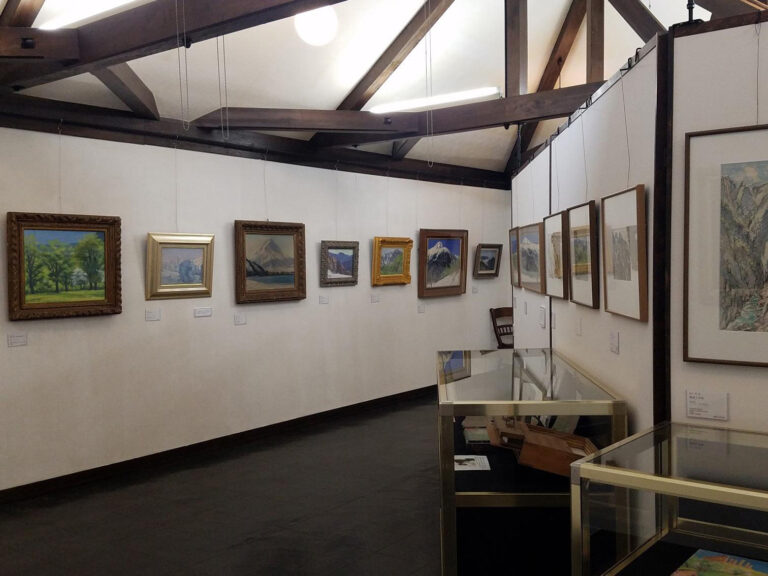 「北アルプスの山麓で山岳絵画のみを展示する」ことを創立の精神に昭和58年(1983)に開館。山岳絵画とは、山麓や平地から描く風景画とは一線を画し、山の頂上やその近くにキャンパスを立てて描く。深雪を踏み分け、ザイルに身を託して描いた作品の数々は見る者を圧倒する。現場写生に徹した近代山岳絵画の先駆者、足立源一郎、吉田博ら日本を代表する山岳画家たちによる油彩画やデッサン、版画の秀作を展示。年4~5回程の企画展、小学生向けの図画工作ワークショップ、一般向けの山のぬり絵ワークショップなどの他、ナイトミュージアムコンサートも開催。カフェテラスも併設。