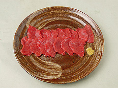 安曇野でキャンプやバーベキューを楽しむなら、ここで肉を仕入れていこう。種類が豊富な精肉店として知られ、長野特産の馬肉もある。併設の焼肉屋では、5種の肉盛り合わせに野菜が付く「常念コース」2700円が人気。