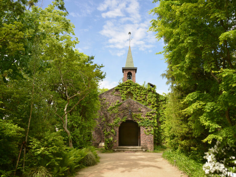 ロダンの彫刻に強い影響を受け、躍動感あふれる作風により日本近代彫刻の扉を開いた荻原守衛[もりえ](碌山)の、『女』『文覚』など全彫刻作品や絵画を収蔵する美術館。交友のあった高村光太郎、戸張孤雁[とはりこがん]、中原悌二郎[ていじろう]の作品も展示。キリスト教精神に生き、30歳で夭折した碌山を偲び、昭和33年(1958)に建設された本館は教会風のレンガ造り。庭の木立とあわせ、安曇野の象徴的風景として知られる。所要40分。碌山館(本館)は登録有形文化財。『女』『北條虎吉像』は重要文化財。