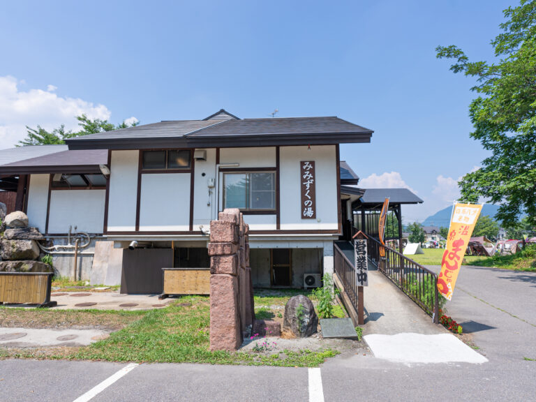JR白馬駅の西方、みみずくの杜の横にある共同浴場。大きな窓が設けられた内湯や露天風呂から白馬三山の景色を展望できる。