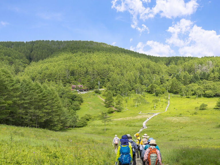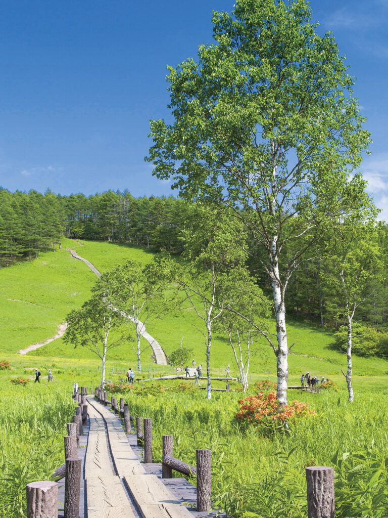 入笠山登山口から標高1955mの山頂までは約30分。ゴンドラ山頂駅から徒歩20分ほどのところにある湿原地帯は100万株の日本すずらんの群生地として知られ、可憐な花が咲き乱れる。クリンソウやレンゲツツジの咲く頃は、高原の白樺林とのコントラストが見事。山頂からは富士山、南・中央・北アルプスなどを見渡すことができ、深田久弥の『日本百名山』のうち22山を見ることができる。