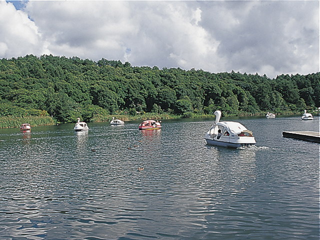 周囲をカラマツや白樺の林に囲まれ、湖面に蓼科山を映す蓼科湖。湖畔にはレストランやみやげ物店が立ち並び、観光客で賑わいを見せる。