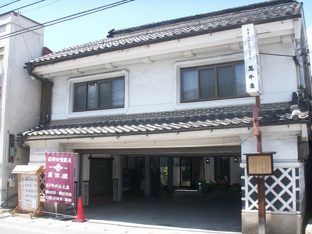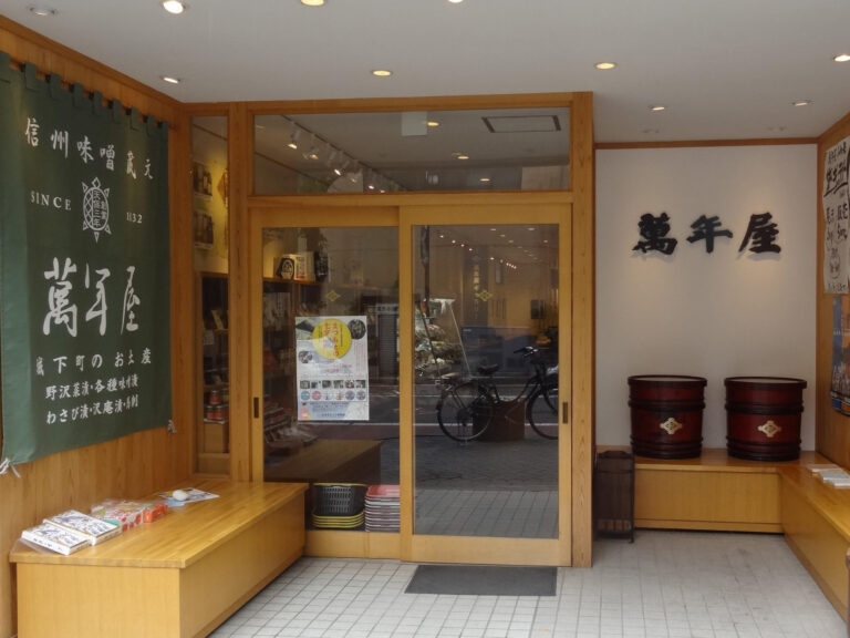 松本城より徒歩5分。天保3年(1832)創業の老舗で、味噌玉づくりの味噌を販売。味噌玉づくりとは、蒸した大豆を潰して円筒状の玉にし、蔵棚で発酵させるもの。萬年屋の蔵に棲みついた酪酸菌がこれに付き、ナチュラルチーズのような独特の風味になる。奈良時代からの製法を伝承し造るため、機械化ができず手間と時間がかかる製法のため、ほとんど市販されていない。職人技の結晶ともいえる味噌は1kg648円~。味噌汁だけでなく、煮物や豚汁などにも合う。自家製わさび漬100g432円・野沢菜漬200g324円・みそ漬1袋324円~も販売。地方発送もできる。